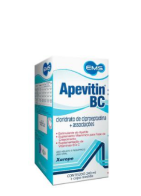 O ApevitinBc Xarope EMS 240ml é um suplemento vitamínico. O produto possui vitaminas B e C, promove o estímulo do apetite e auxilia na fase de crescimento das crianças. Uso Adulto e Pediátrico.
