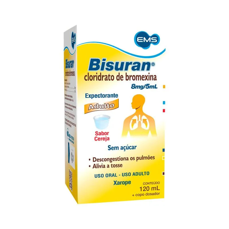 Bisuran Xarope é um medicamento expectorante, comercializado em embalagem com 120ml + copo dosador, fabricado pelo laboratório EMS. É indicado para o tratamento de doenças broncopulmonares (dos brônquios e pulmões), ajudando a dissolver o catarro e facilitando a expectoração.