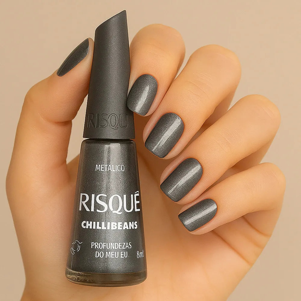 O esmalte Profundezas do Meu Eu da coleção Risqué & Chilli Beans Colorindo Seus Instintos é um cinza com acabamento metálico, secagem rápida e ultra brilho, além de ter longa duração nas unhas. Todos os esmaltes são cruelty-free e com fórmula hipoalergênica. Conheça a nova coleção Risqué & Chilli Beans com esmaltes, óculos e relógios exclusivos cocriados nos mínimos detalhes para você colorir seus instintos!